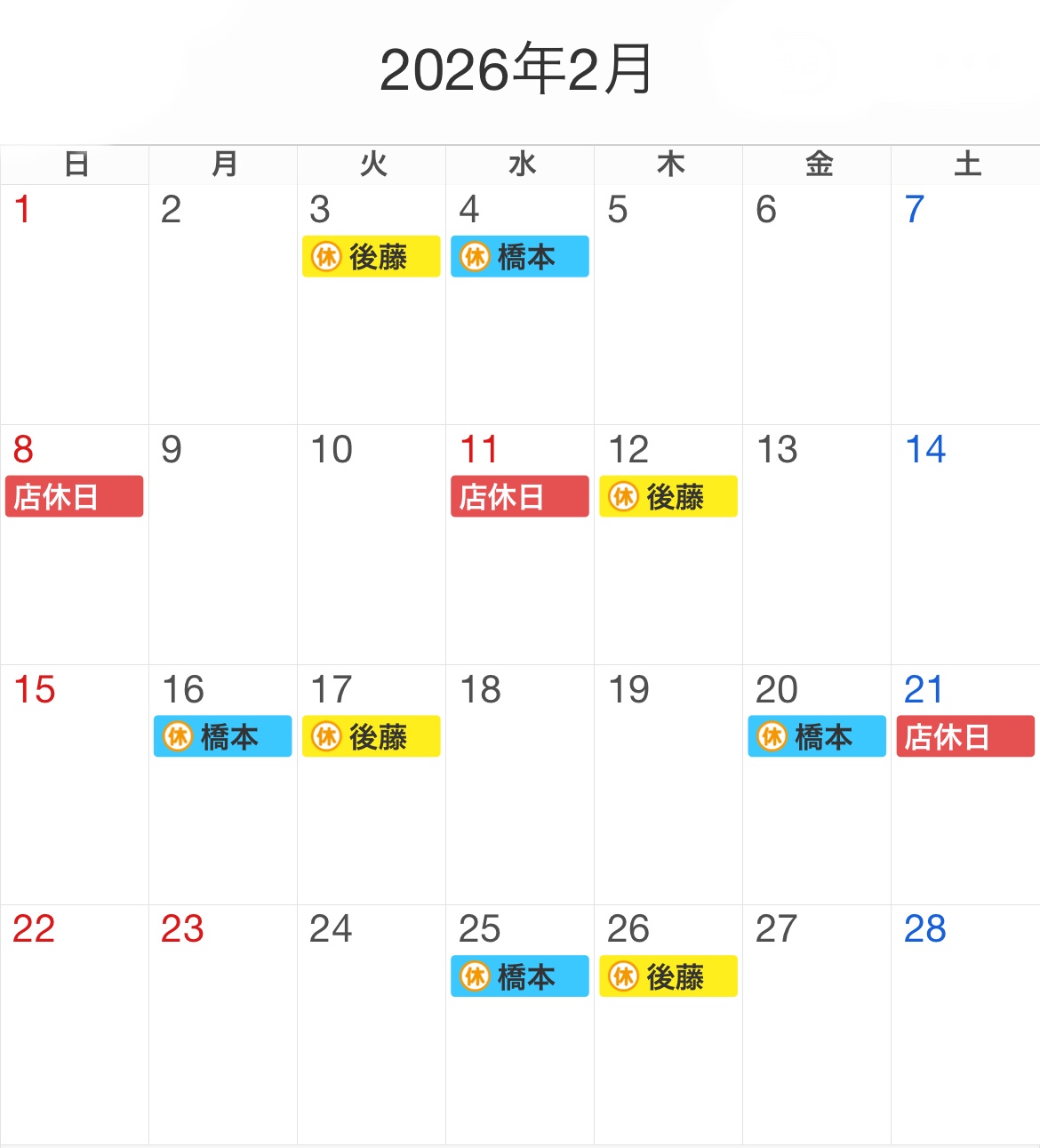 その他スタッフの休みはカレンダーで確認お願いします